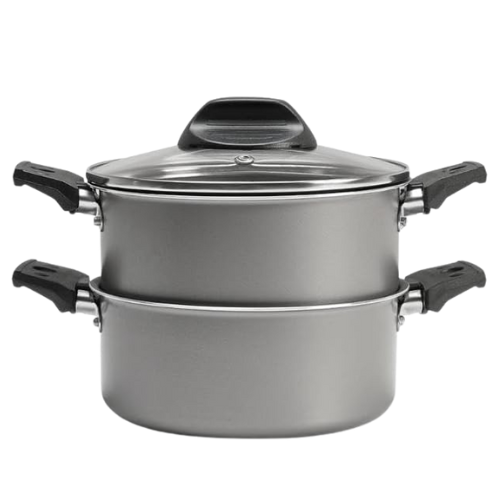 Panelas com múltiplos níveis permitem cozinhar diferentes alimentos simultaneamente, economizando tempo.